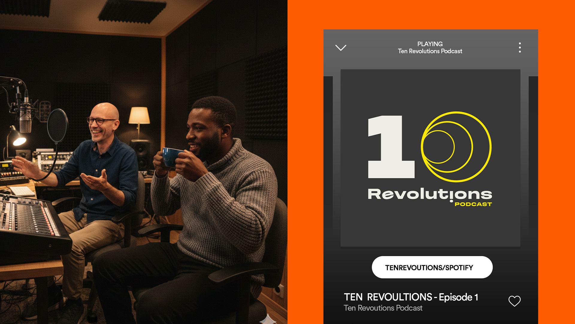Ten Revolutions, the podcast sub-brand, extends this foundation in a more playful direction. Dynamic numerals, ripple-like motifs, and vibrant accent colours introduce movement and rhythm, evoking the idea of ideas expanding outward. This language feels energetic and audio-responsive, yet still grounded in the core brand principles.